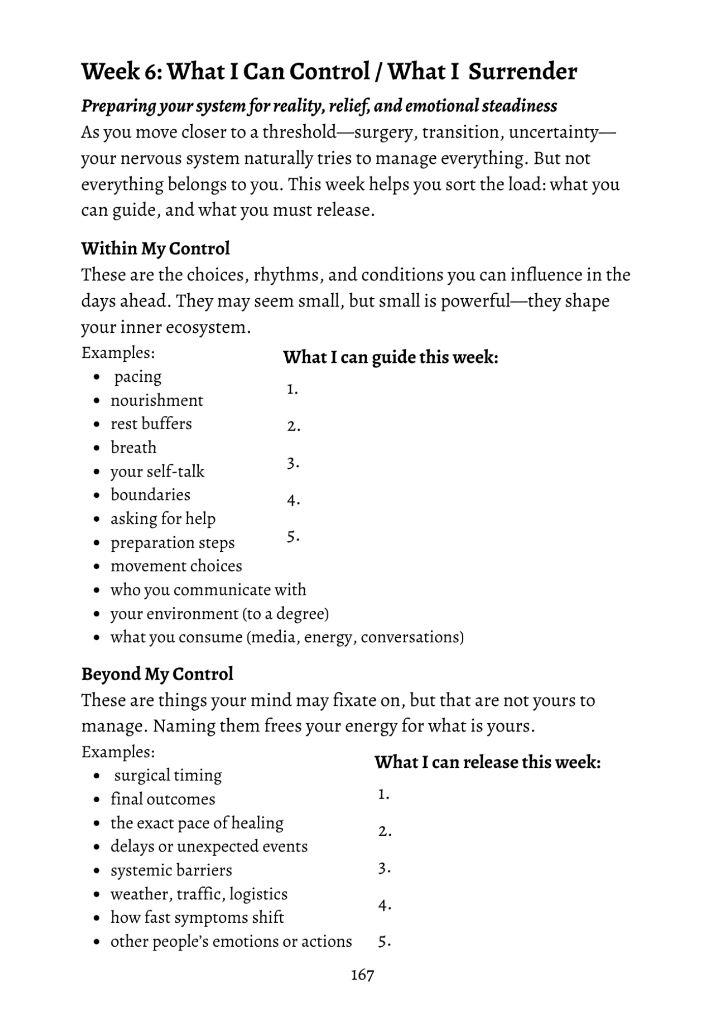 I didn’t want to “manage” this season. I wanted to meet it. So I returned to the tools I’ve built for clients over the years—the pacing protocols, the symptom maps, the boundary scripts, the nourishment rhythms, the nervous-system supports. And I began redesigning them through the lens of this immediate reality.